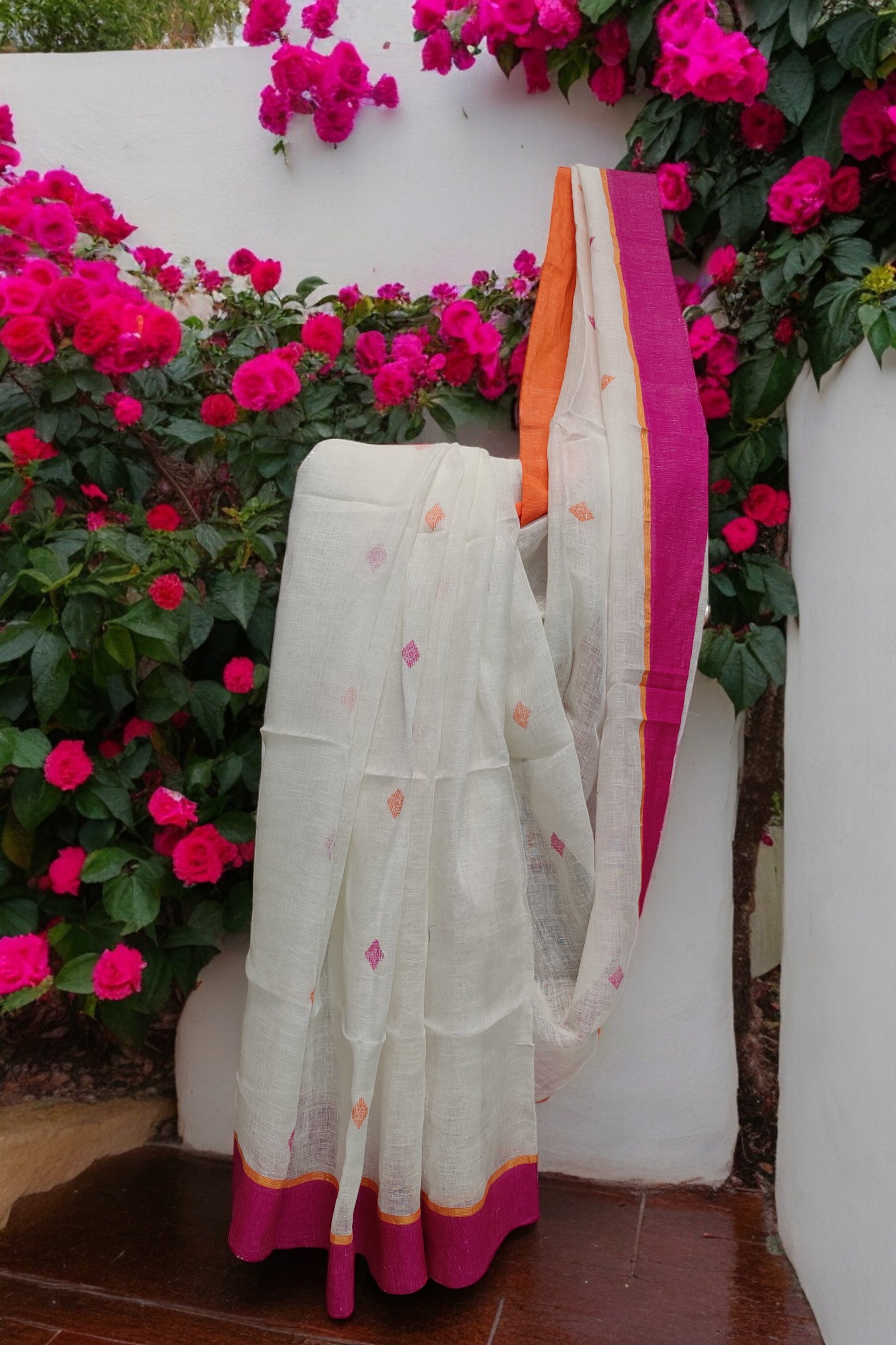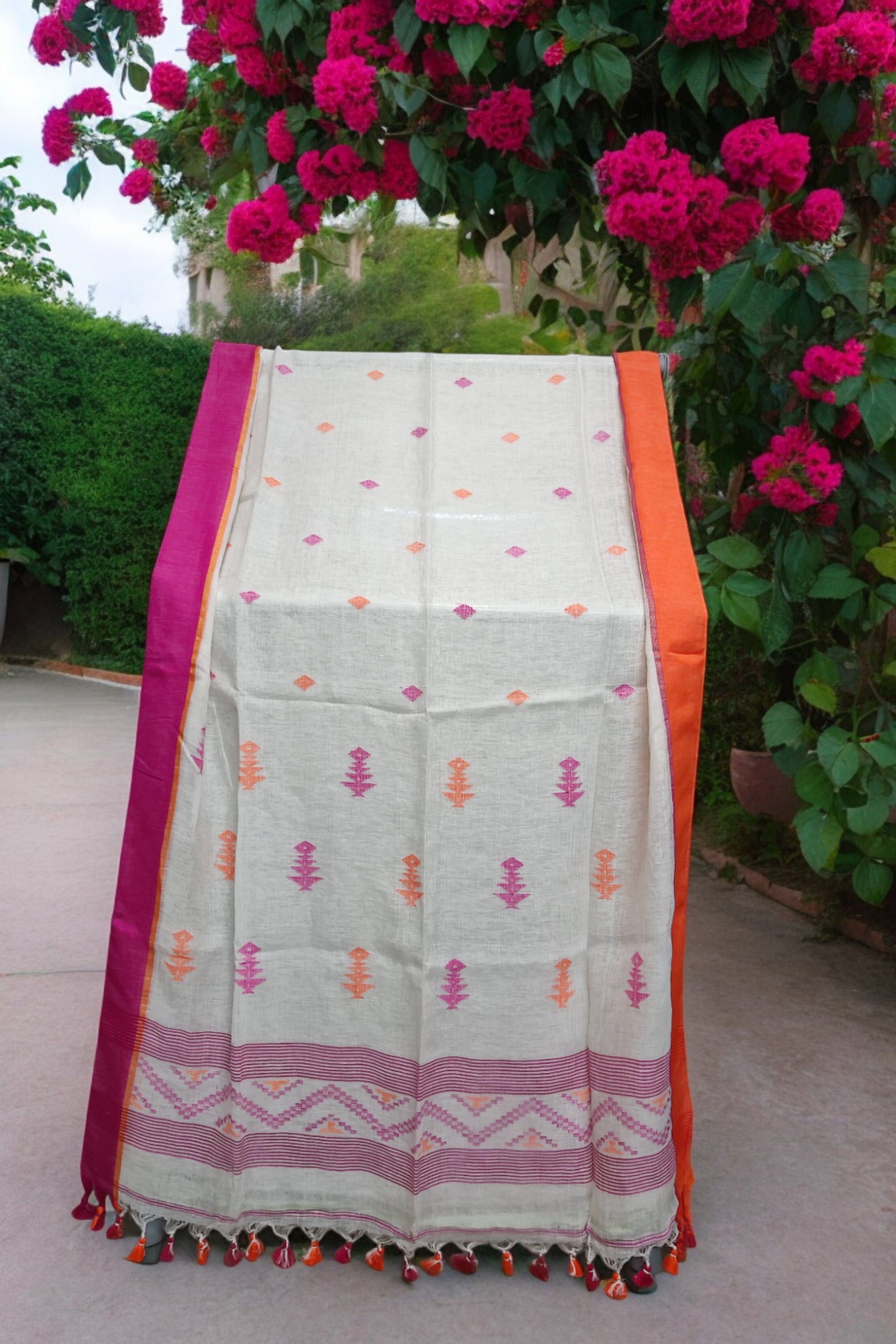 This handwoven pure linen Jamdani saree features intricate motifs woven with fine craftsmanship and is enhanced by a striking Ganga Jamuna border. Its elegant contrast and airy texture make it a perfect blend of tradition and sophistication.
