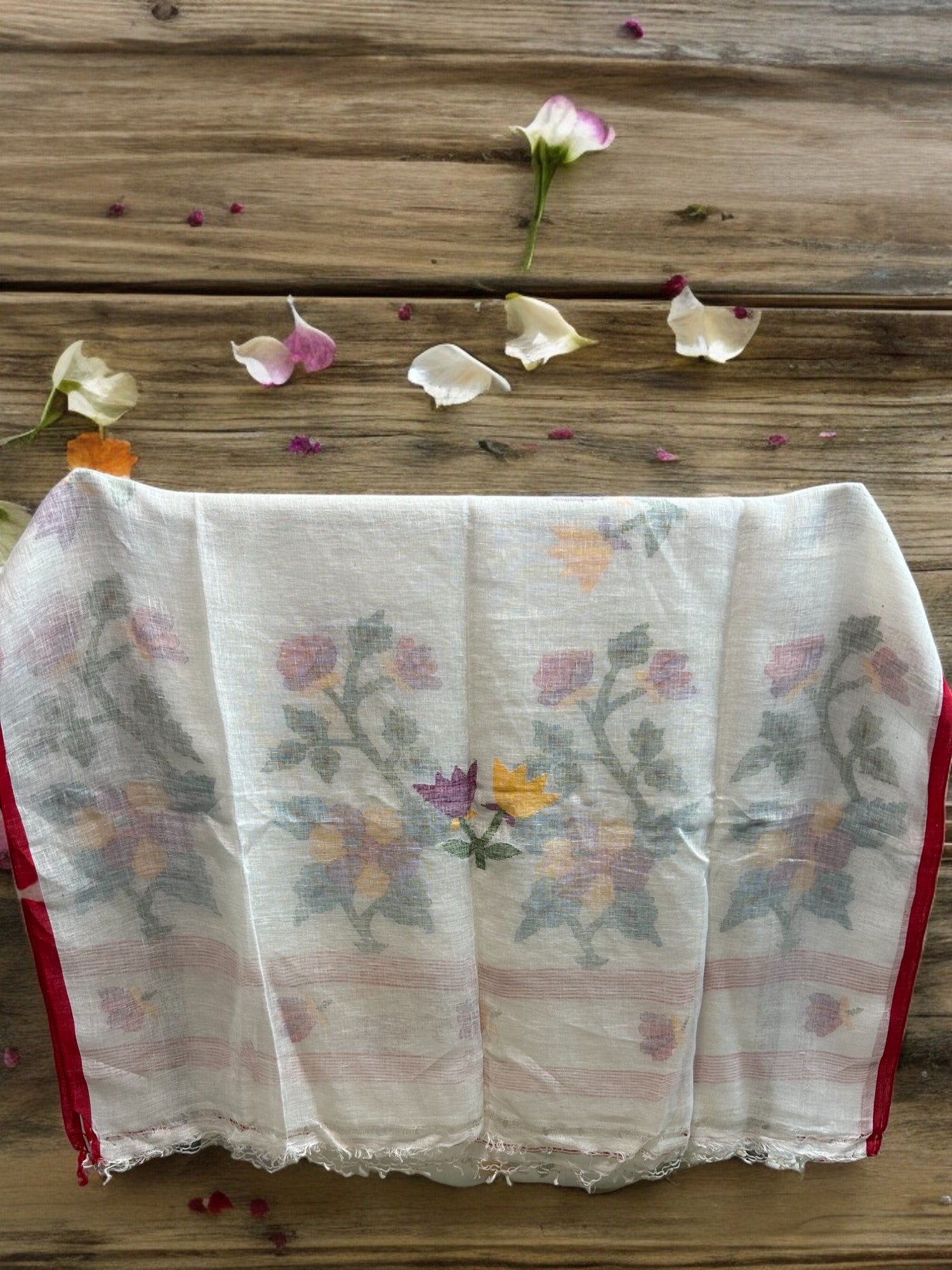This handwoven Jamdani saree is crafted from soft, premium linen, offering a lightweight and elegant drape. It features delicate floral motifs intricately woven in pastel shades, blending traditional artistry with contemporary charm.