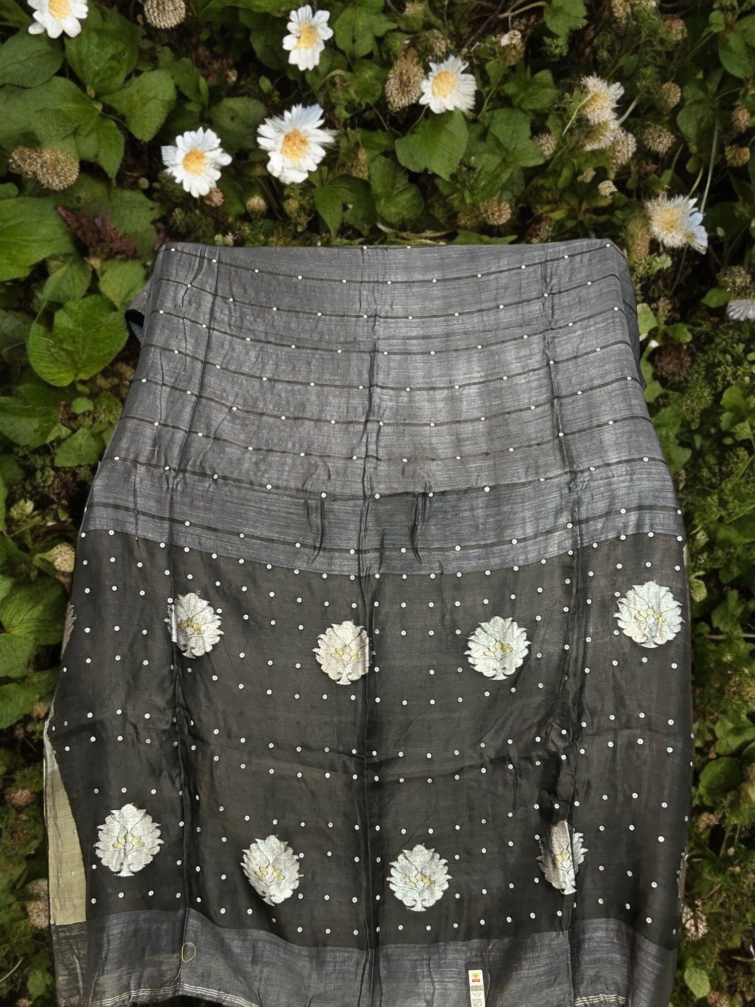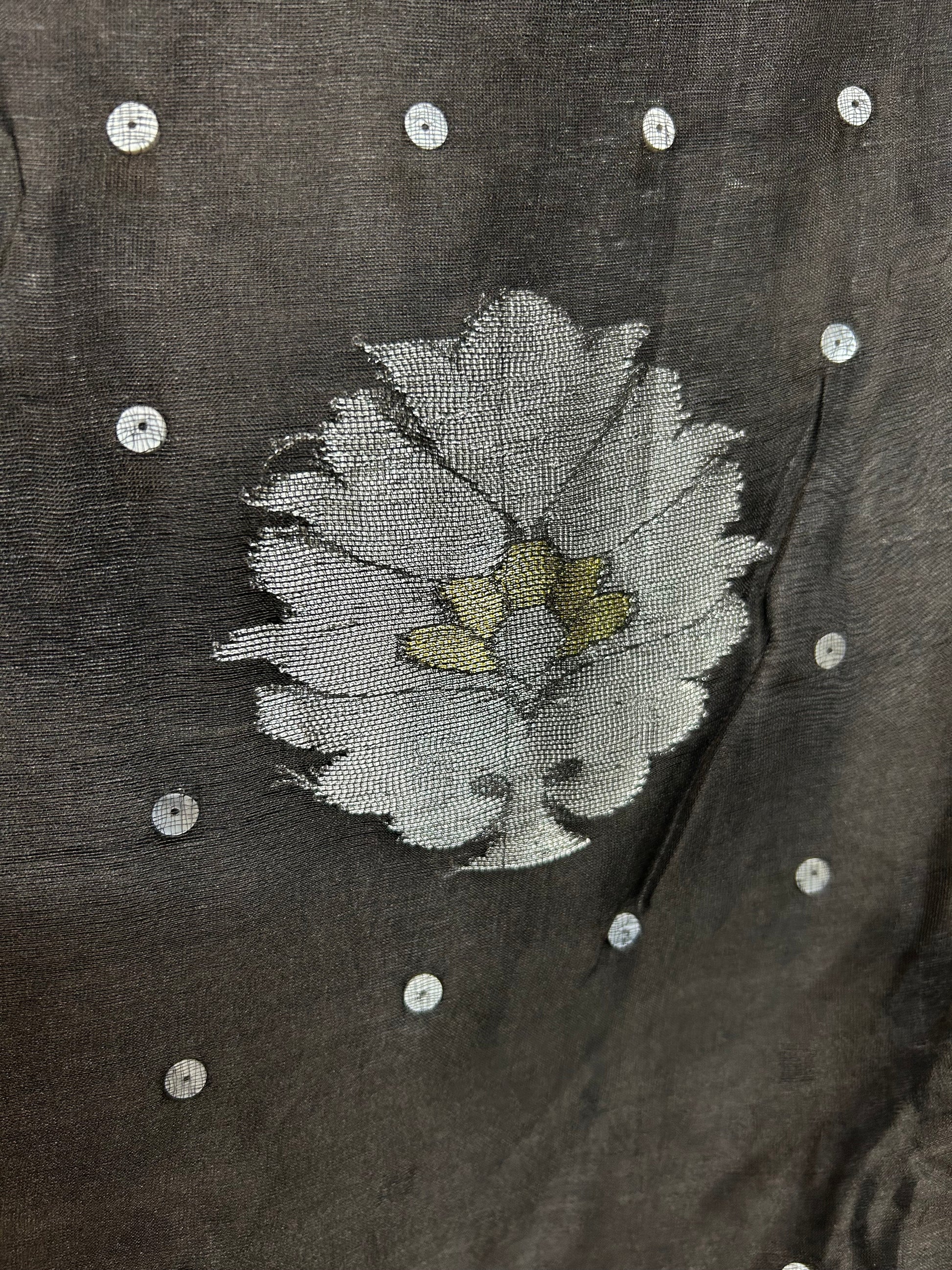 This pure Matka silk saree features exquisite Jamdani motifs woven in gold and silver zari on a muslin pallu, adding regal elegance. The body is uniquely adorned with sea shell patterns, creating a harmonious blend of tradition and artistic innovation.