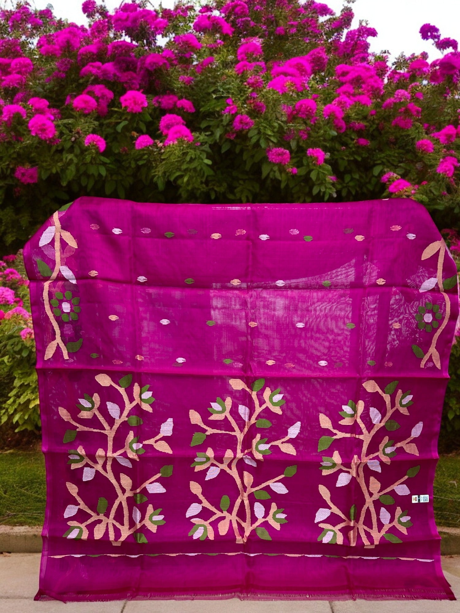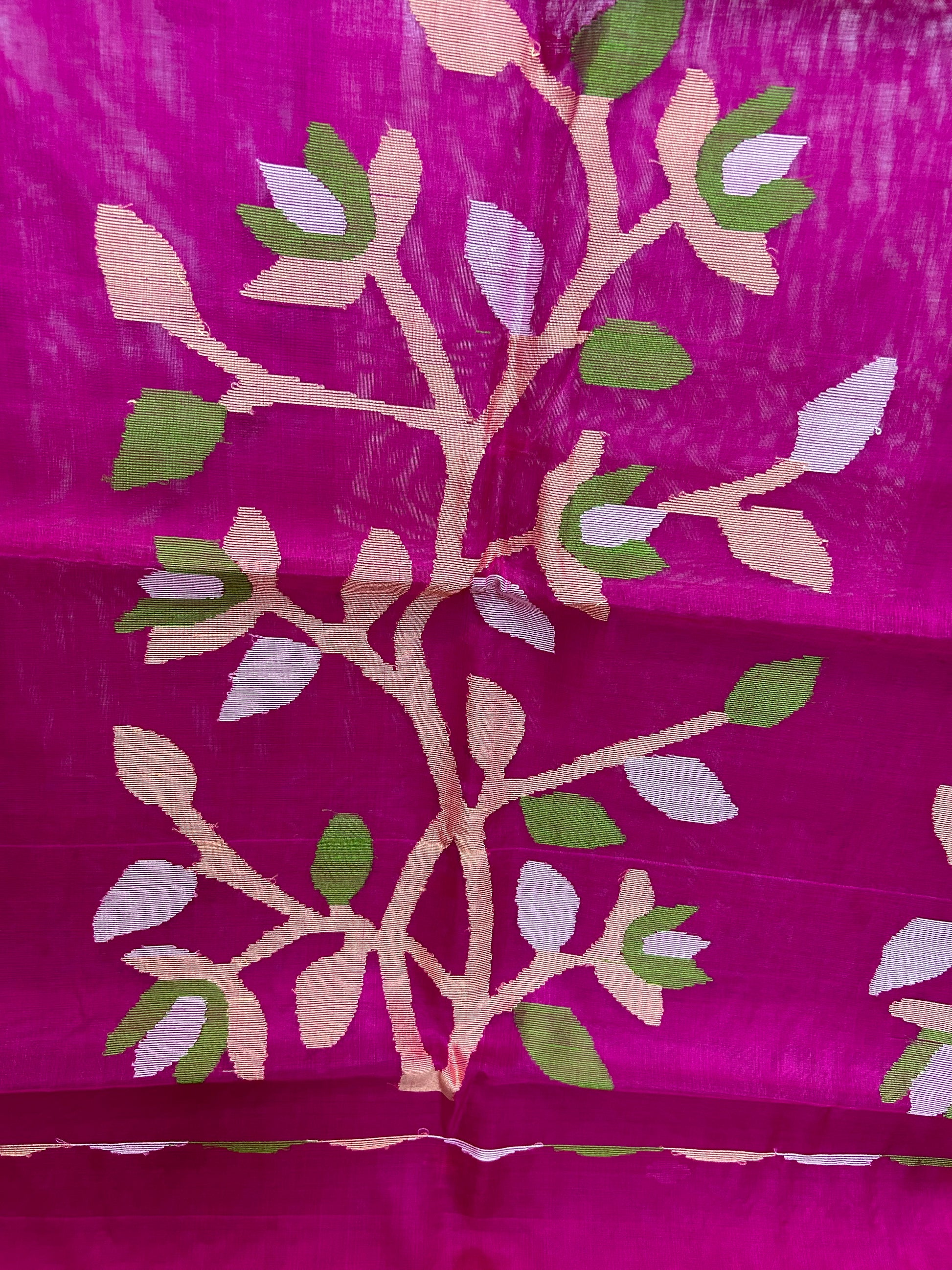 This pure Resham Jamdani saree is handwoven with delicate floral motifs spread across the fabric, showcasing the finesse of traditional Jamdani craftsmanship. Its soft, lustrous texture and intricate detailing make it a graceful and timeless drape.