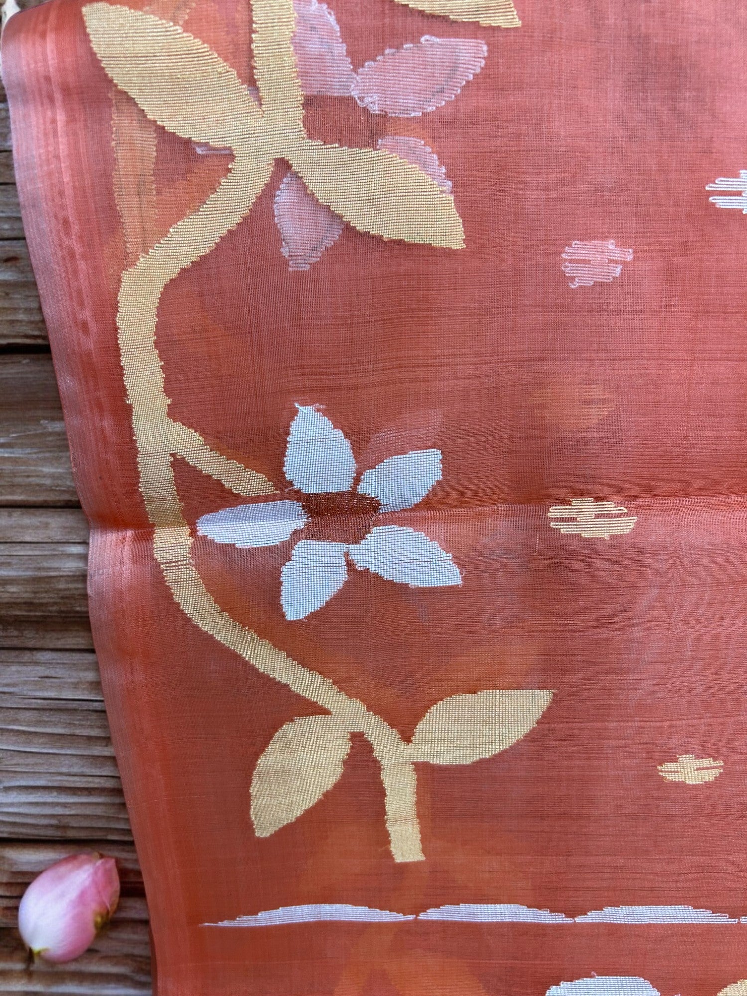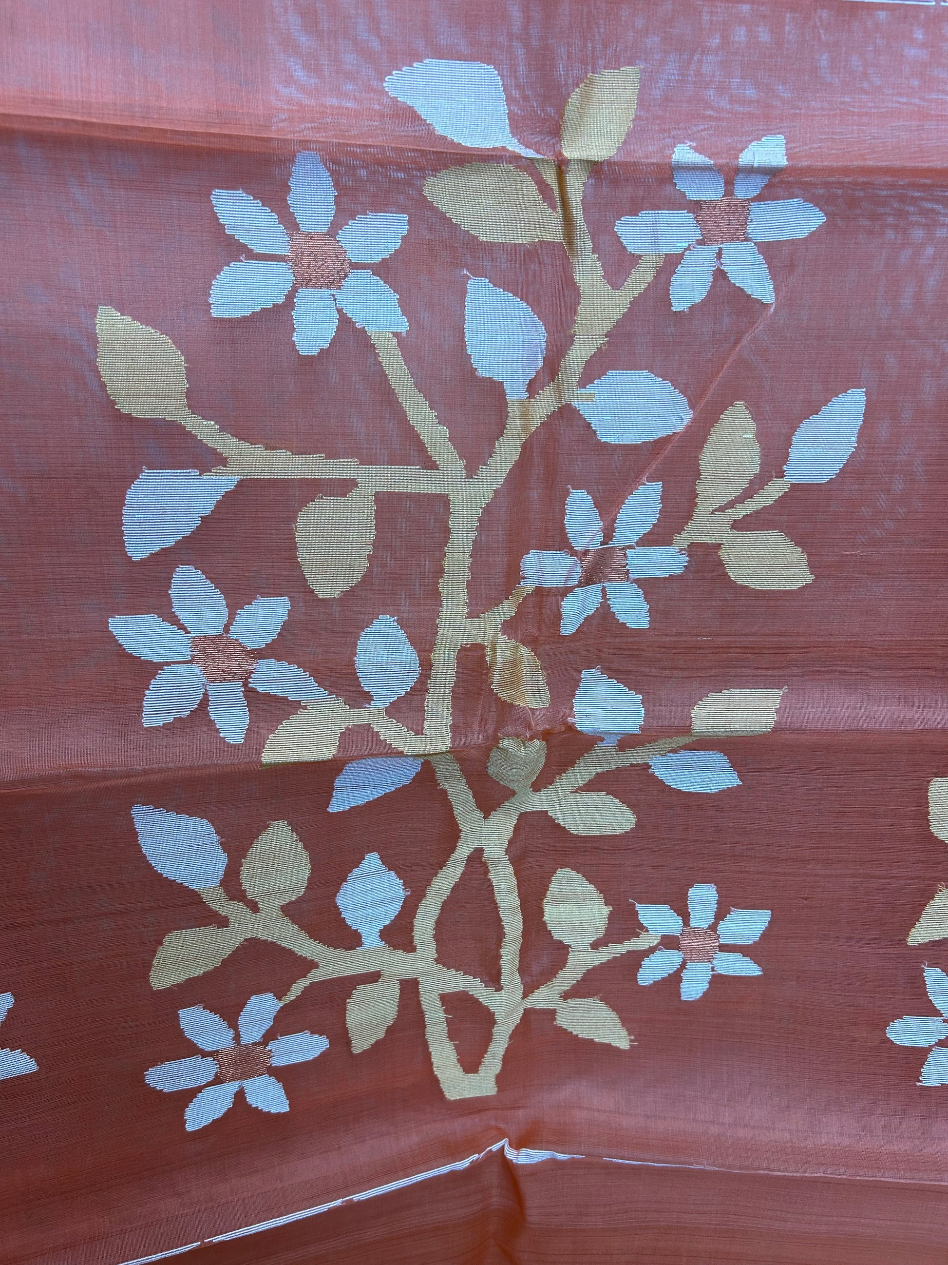 This pure Resham Jamdani saree is handwoven with delicate floral motifs spread across the fabric, showcasing the finesse of traditional Jamdani craftsmanship. Its soft, lustrous texture and intricate detailing make it a graceful and timeless drape.
