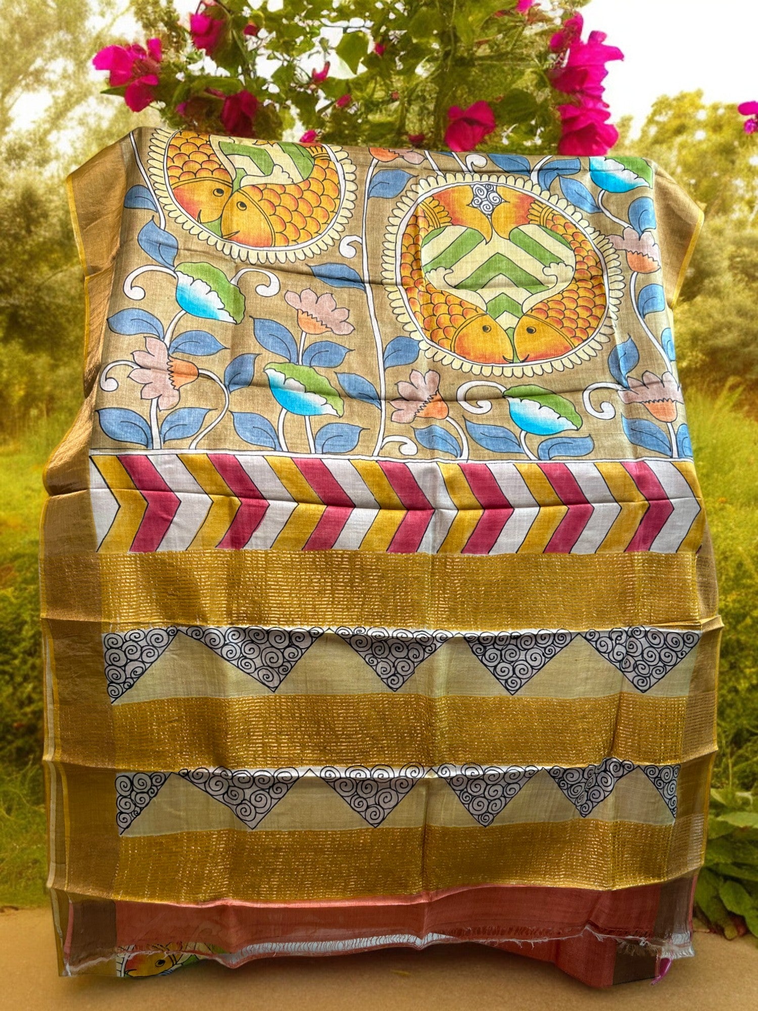 This pure Tussar silk saree features exquisite Pen Kalamkari artwork, hand-drawn with natural dyes to depict intricate traditional motifs. Its rich texture and artistic elegance make it a timeless statement piece.