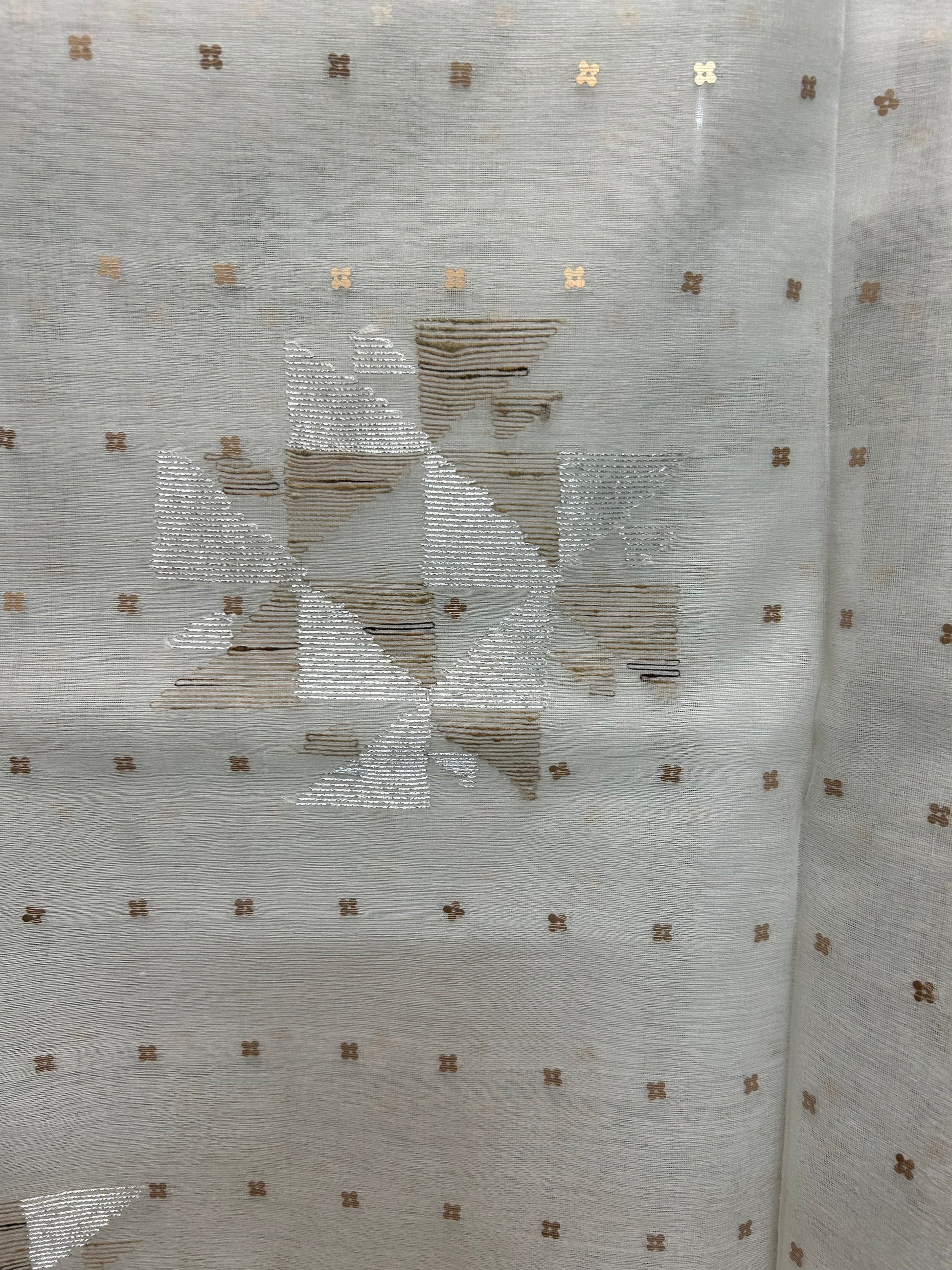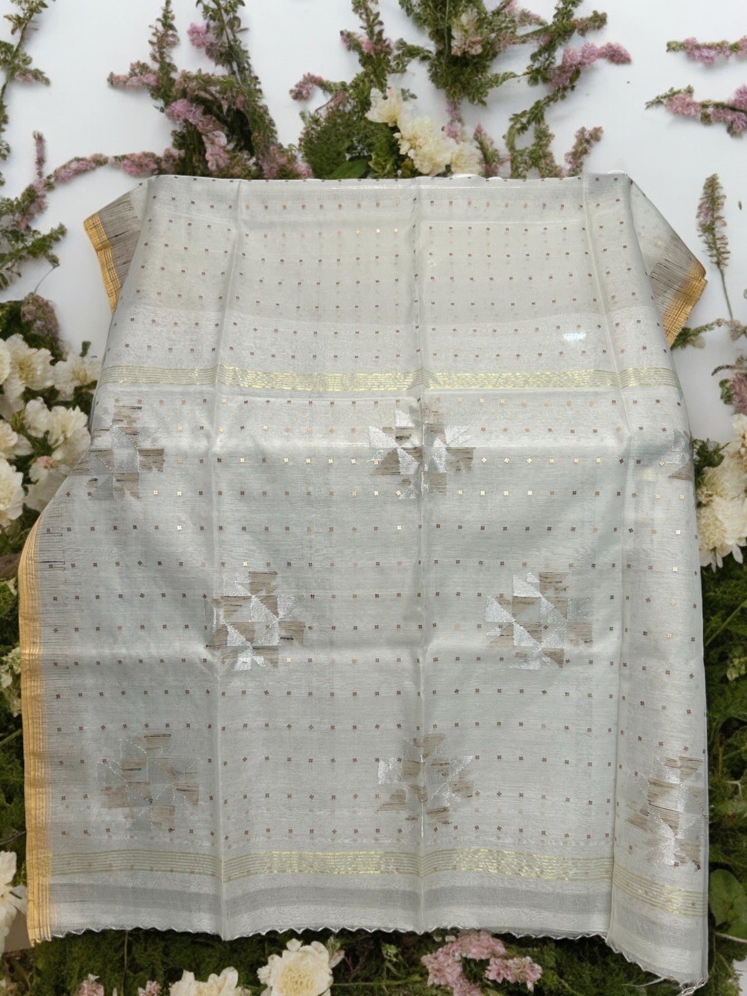 This sequin muslin saree is a handwoven masterpiece where shimmering sequins are intricately woven into the soft, airy muslin fabric. The blend of subtle sparkle and fine craftsmanship creates a graceful, lightweight drape perfect for elegant occasions.